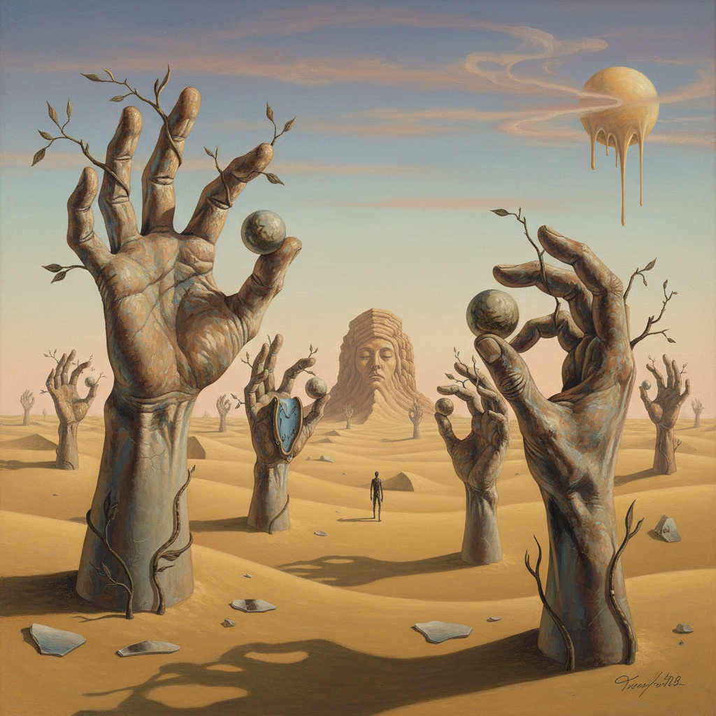 "A surreal desert where giant human hands grow out of the sand like trees, painted in Dali-style realism"