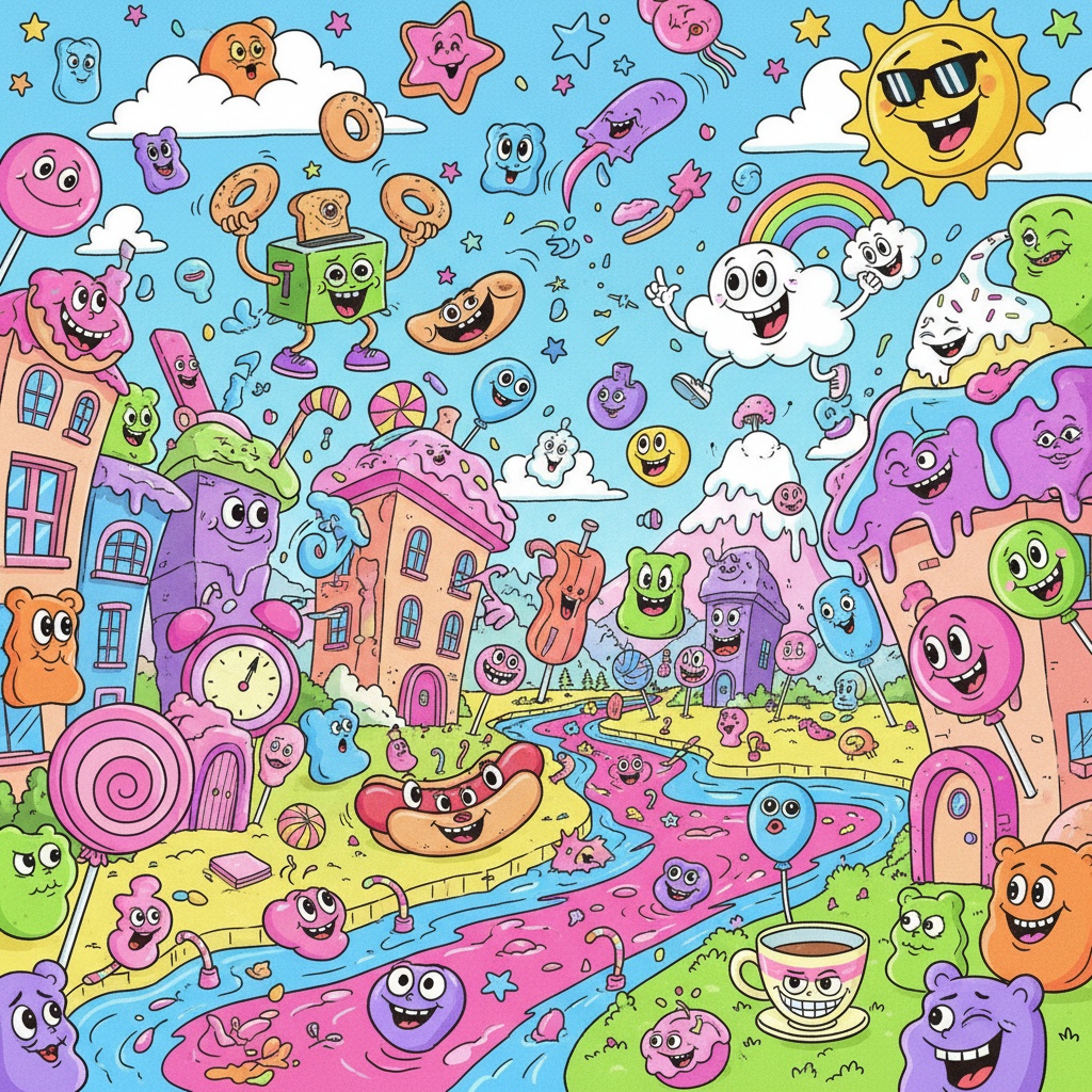 A cartoon universe where every object has a face, candy-colored, chaotic energy, surreal Nickelodeon vibe.