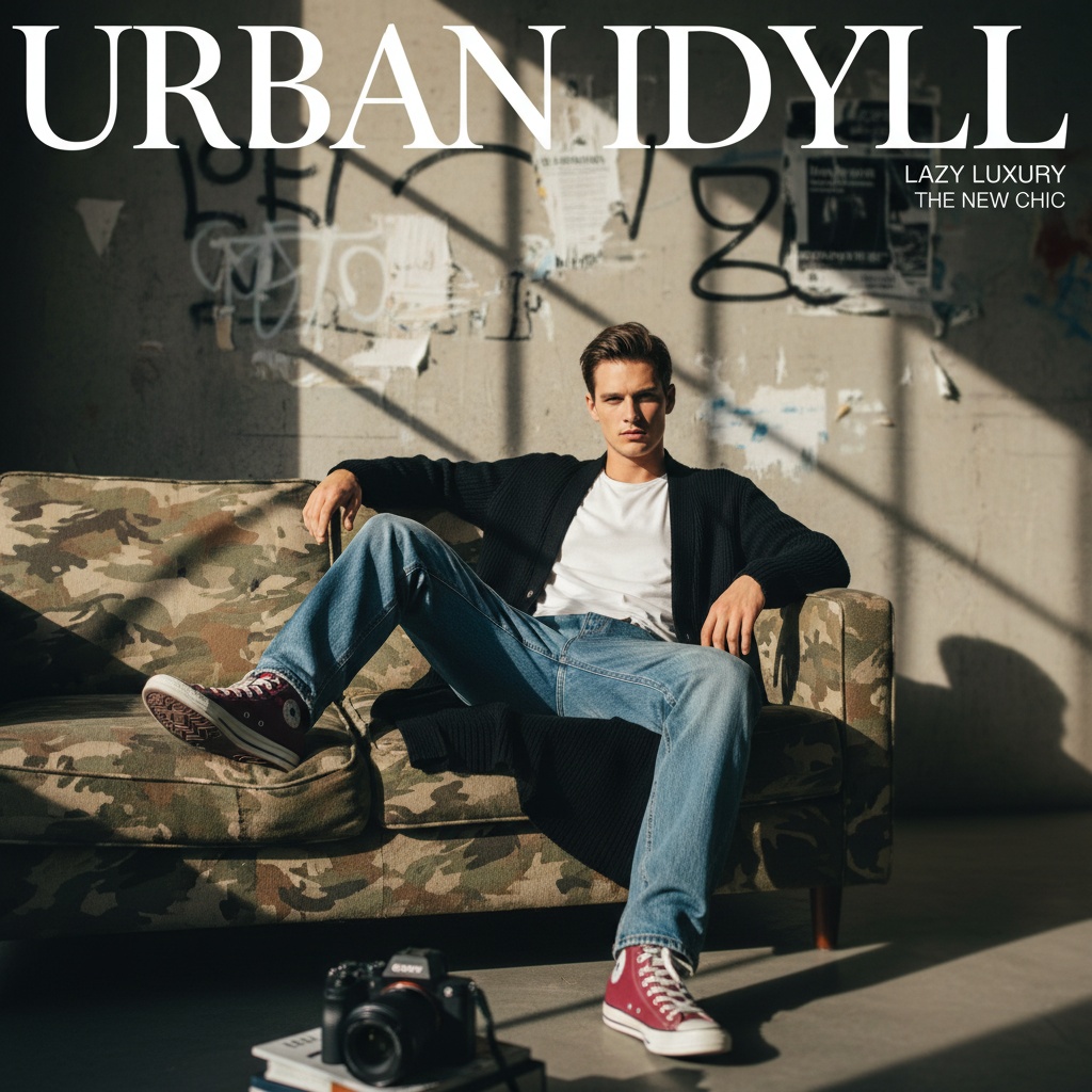 "photography, magazine cover, tilt shot, male model lounging on a worn camouflage sofa, casually dressed in a white T-shirt and a long black cardigan with relaxed denim jeans, maroon Converse sneakers, used camera Sony α9, focus on the fashion model, setting is urban vibe with a rough concrete wall in the background and shadows from the window creating patterns across the scene, lazy afternoon in a chic, 16K, rich detailed"