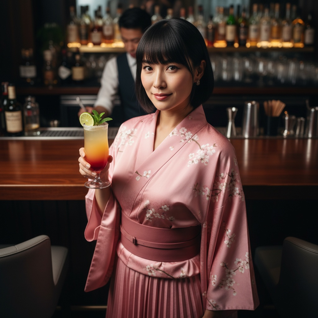 "Photorealistic image of a Japanese woman wearing a pink kimono-inspired modern outfit, short black hair with bangs, she holds a drink while looking at the camera, posing by the bar. High angle camera shot."