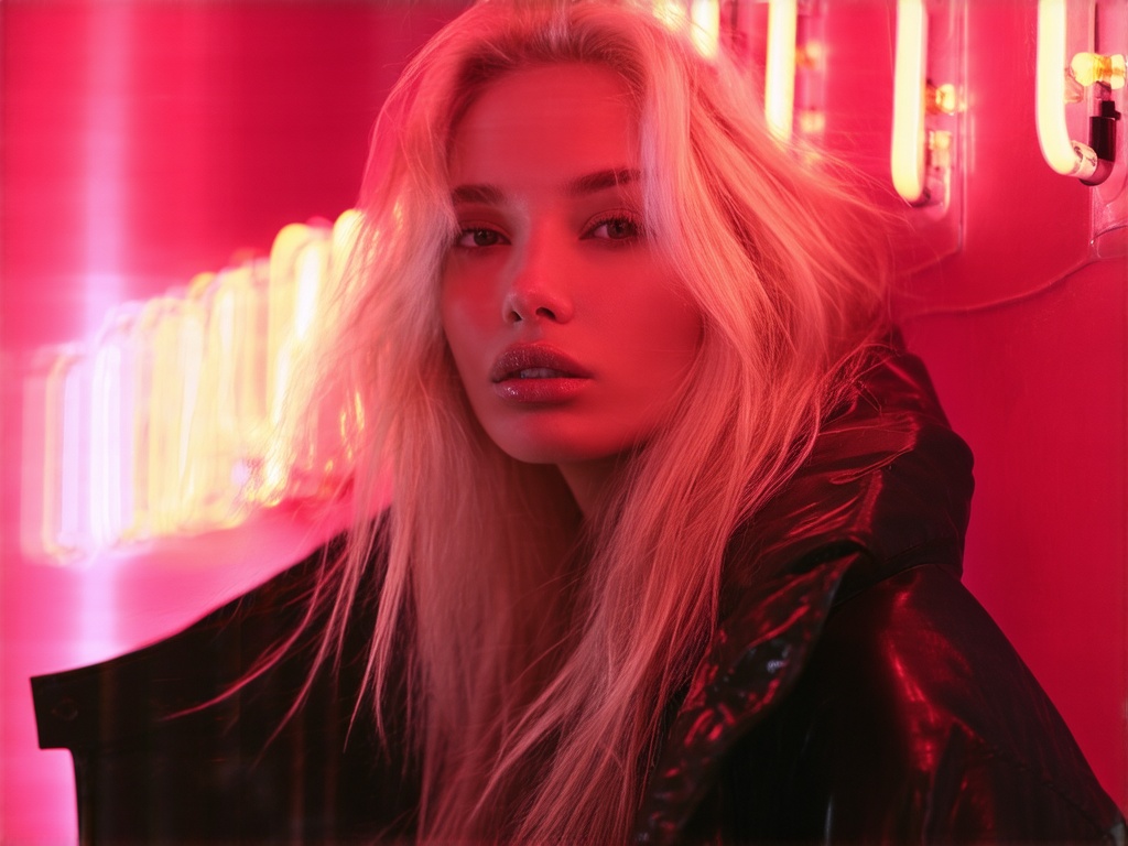 digital art, fashion editorial, a close portrait of beautiful blond woman is studio double exposure red neon lights, highres, realistic photo, professional photography, cinematic angle, dynamic light back shining,