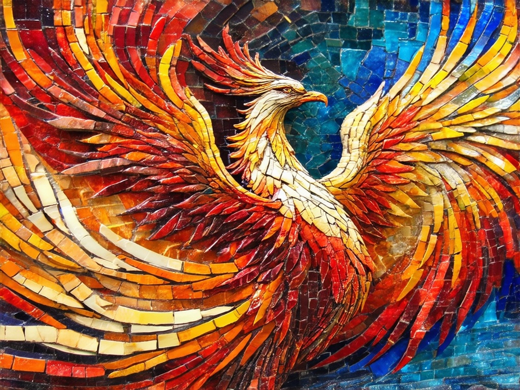 A 3D mosaic sculpture of a phoenix rising, vibrant colors, mosaic tiles texture, bird’s eye view