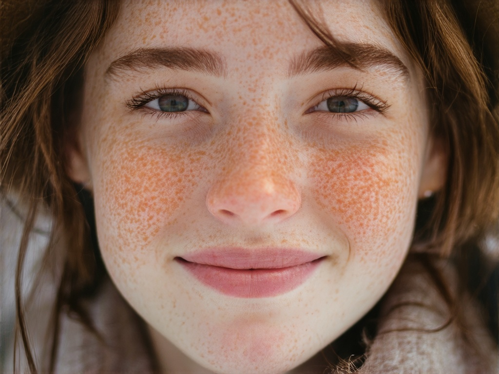A high-resolution photograph of a young woman with light freckles, soft natural lighting, shallow depth of field, candid expression, subtle smile, sharp detail in eyes and skin texture.